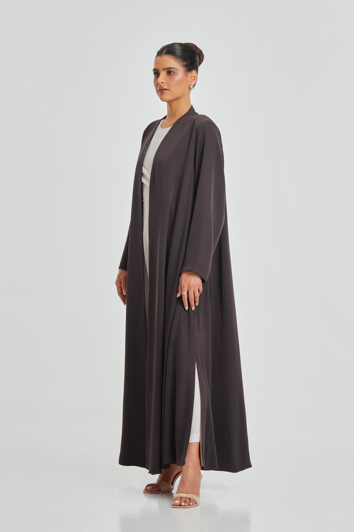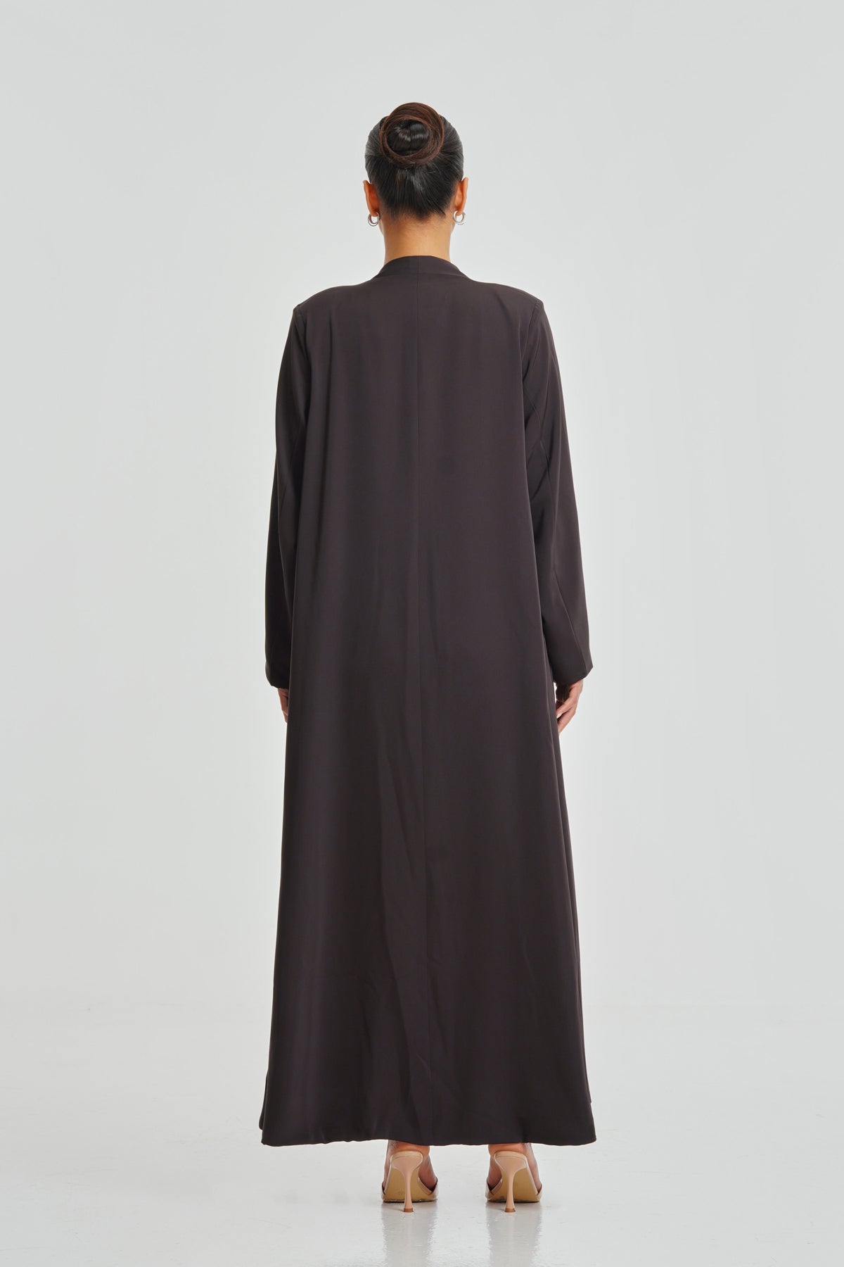 A dark brown Korean Nada abaya enhanced with a soft light brown border. Comfortable, elegant, and perfect for everyday use, designed to flatter all women.
