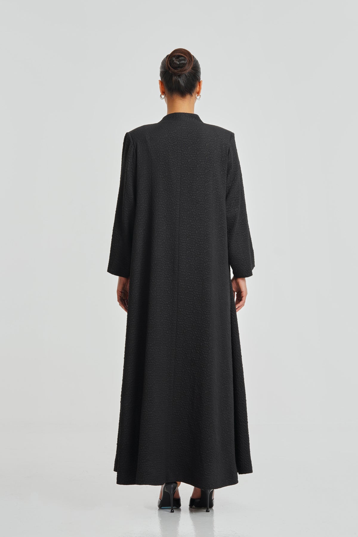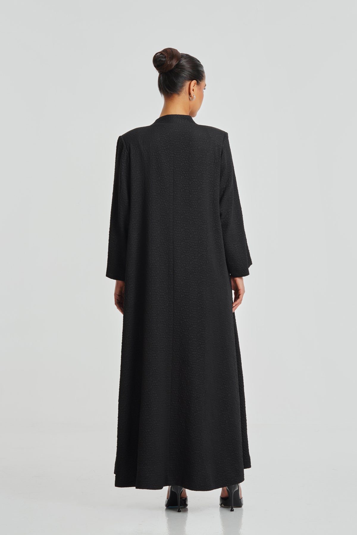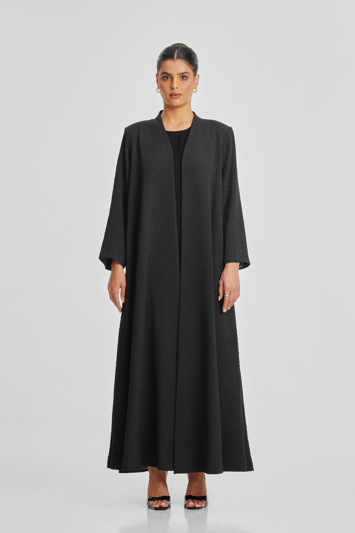 A unique black dotted Korean Nada abaya featuring a soft texture and premium Italian satin lining. Designed for daily wear, it offers comfort, elegance, and a feminine touch that suits every woman. The pattern adds subtle detail while maintaining a classic look.