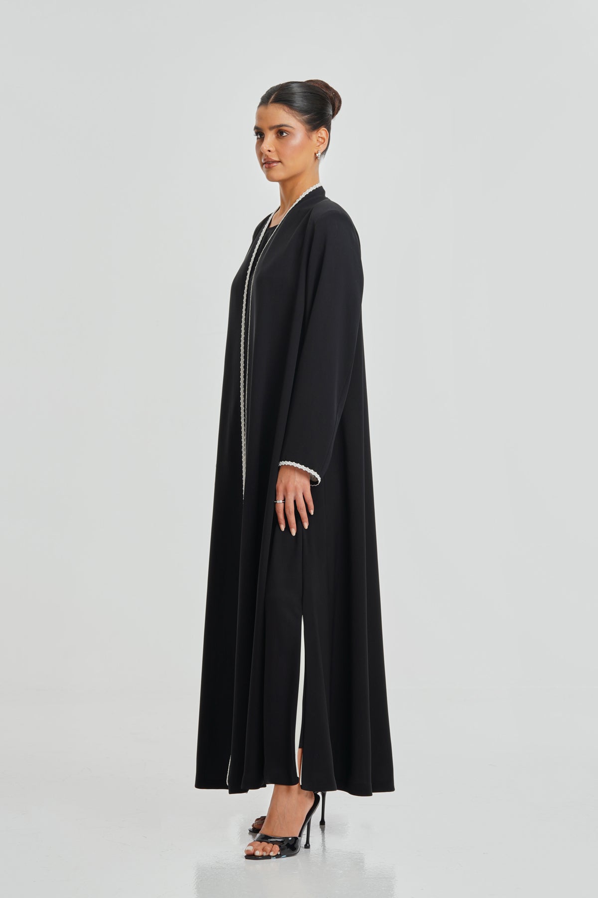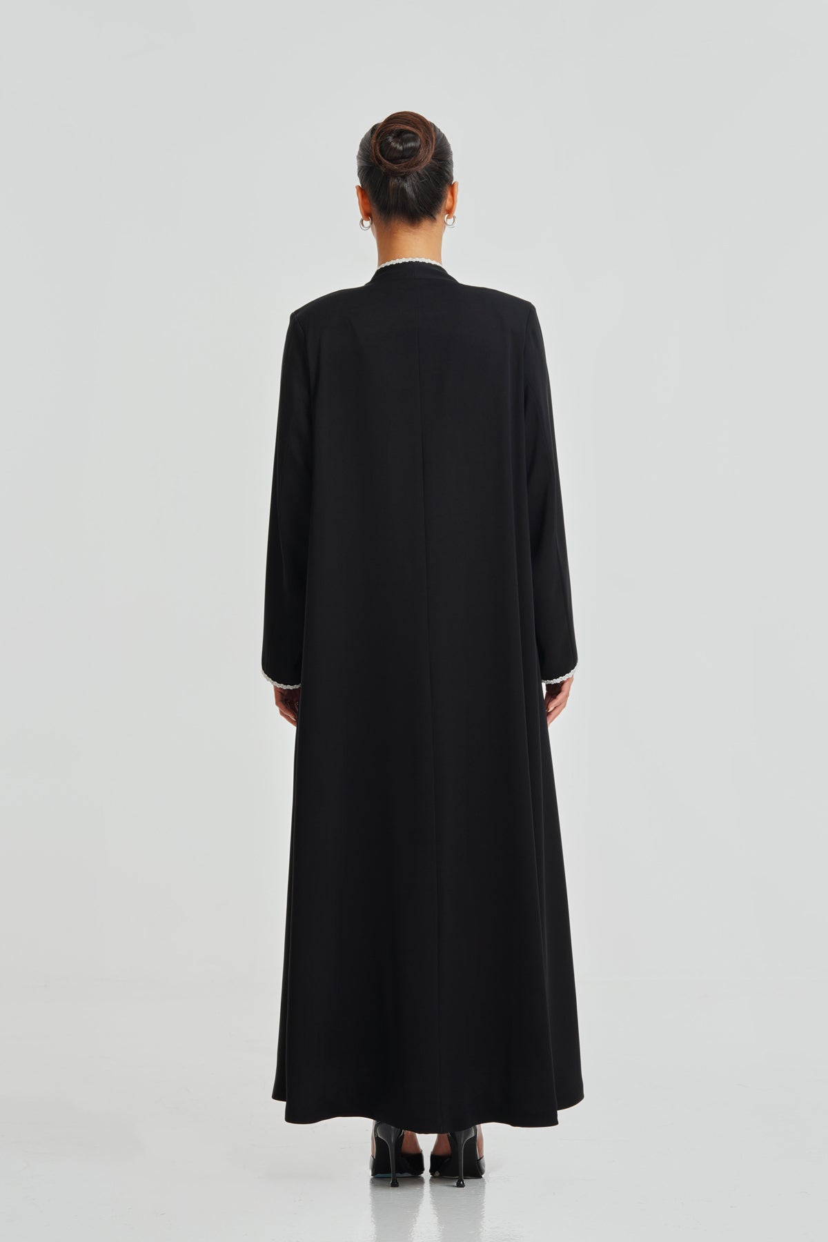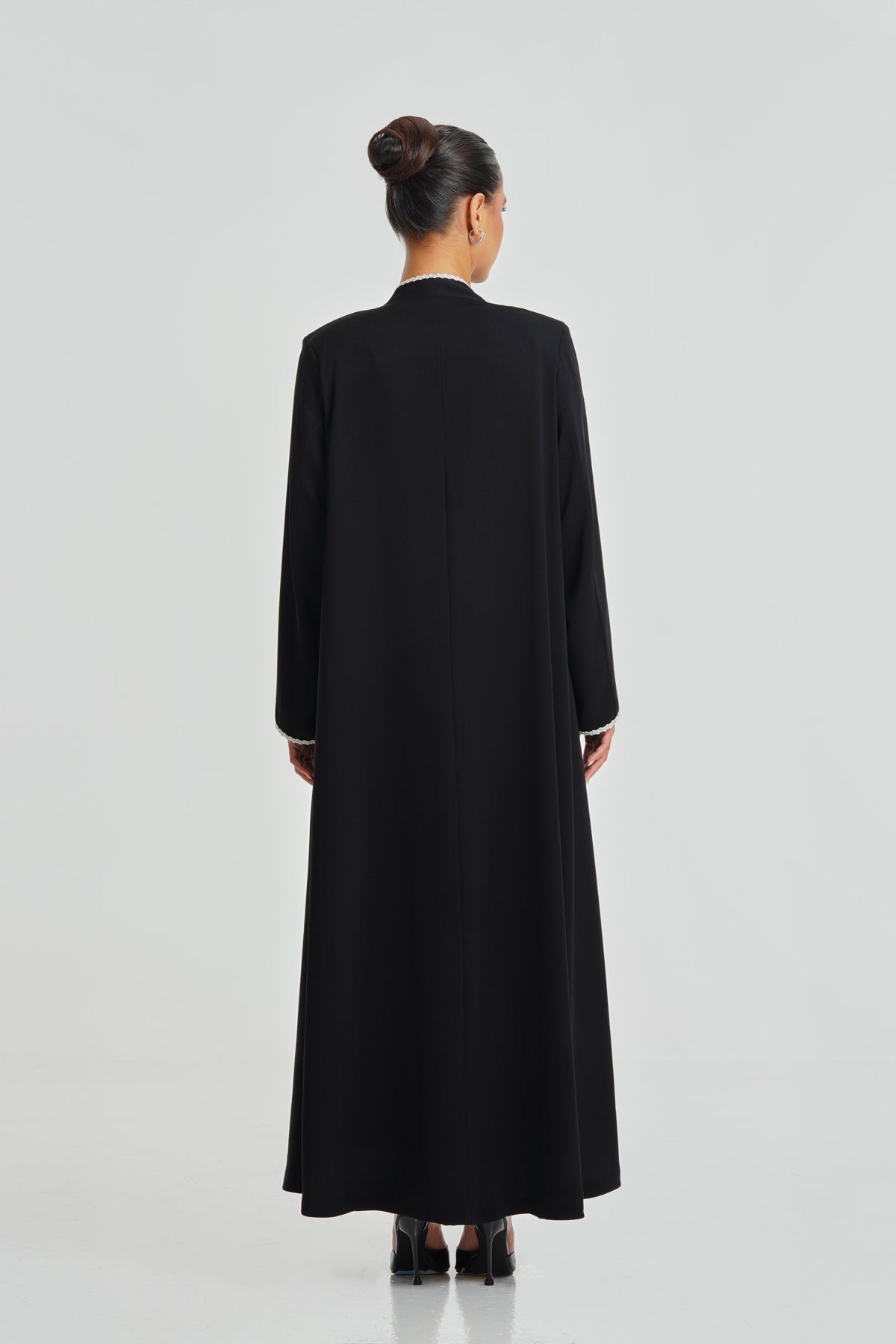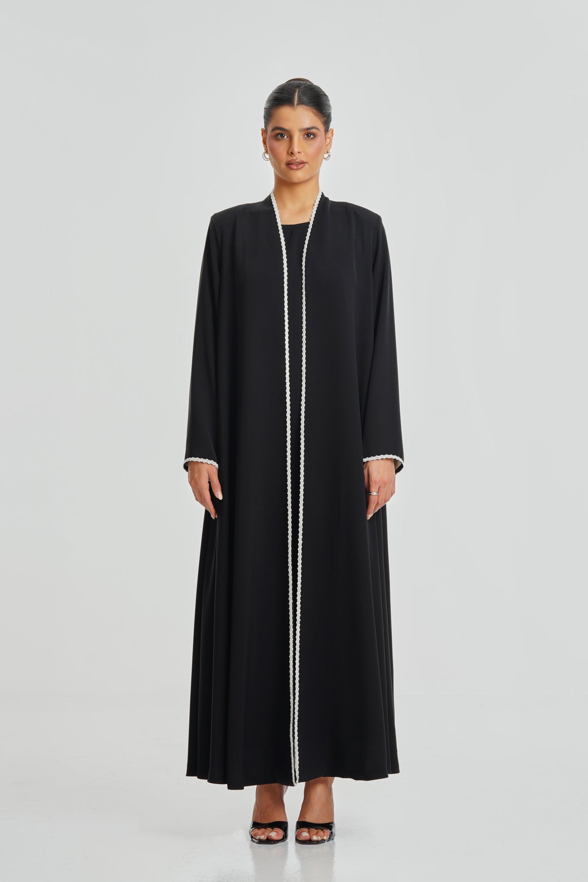 A timeless black Korean Nada abaya enriched with hand-stitched lace. Soft, elegant, and ideal for daily wear, complementing every woman effortlessly.