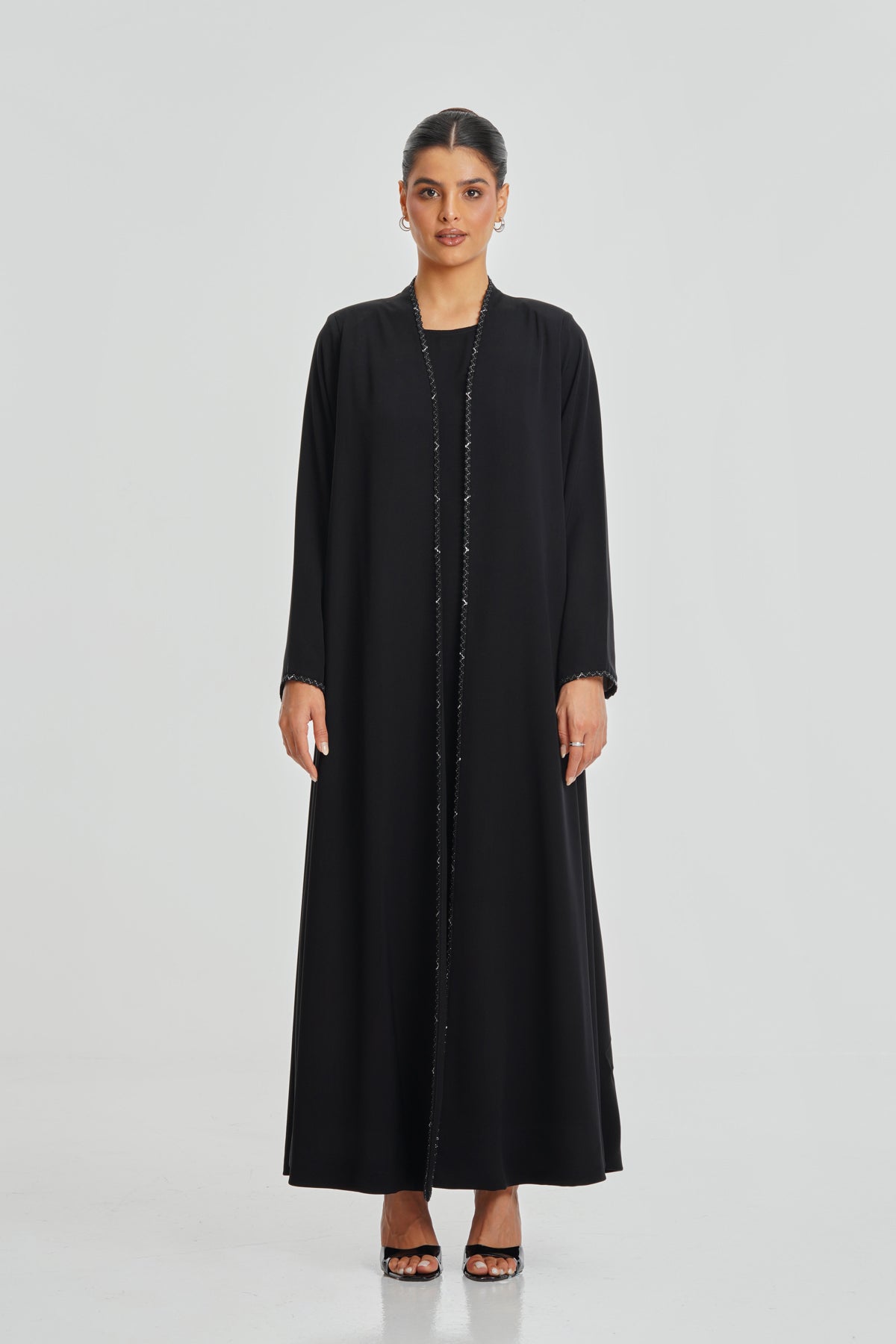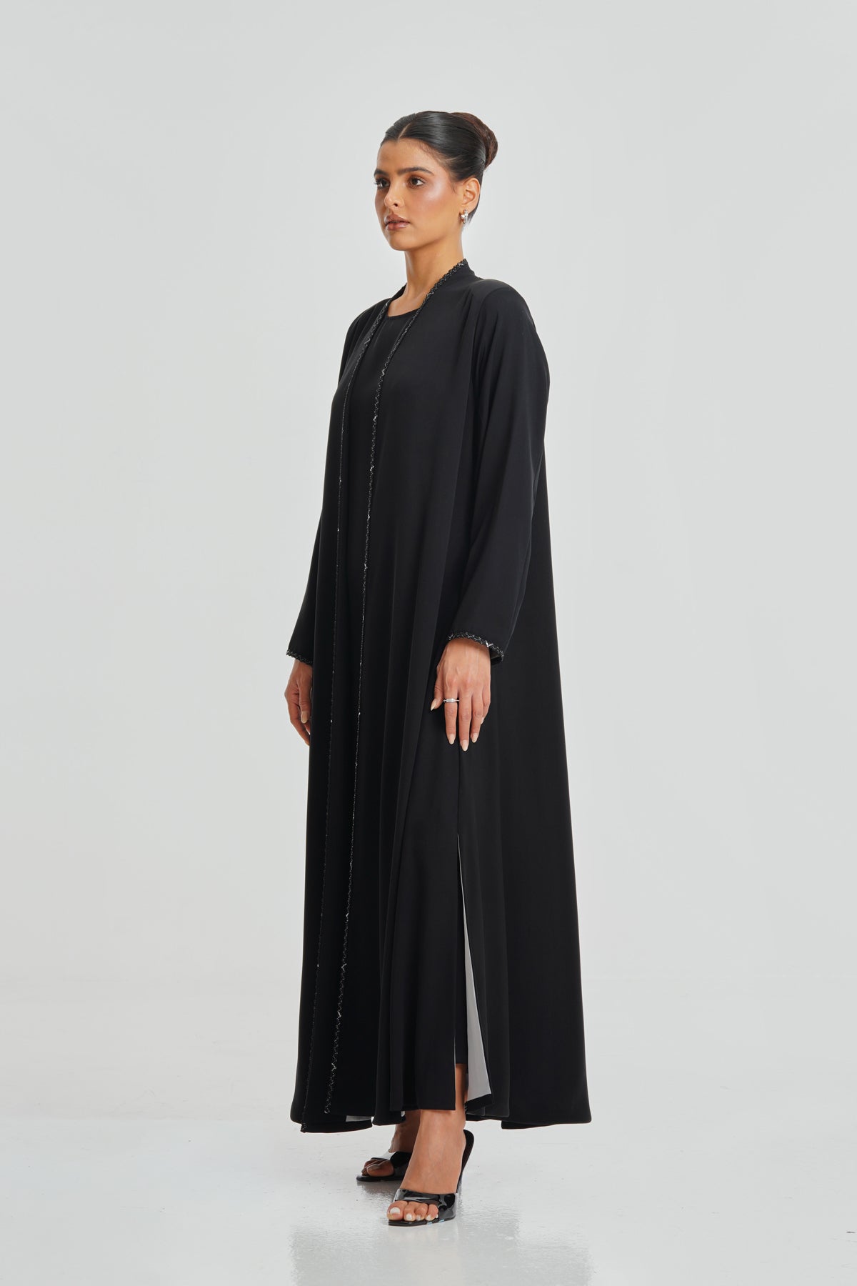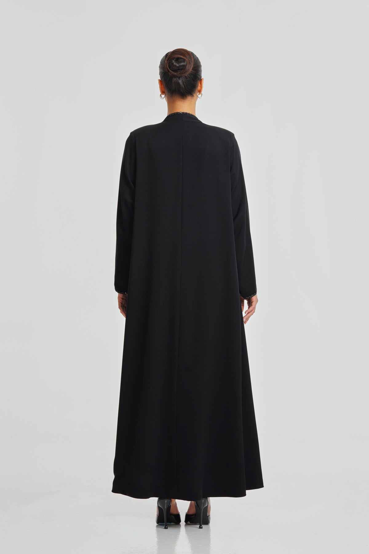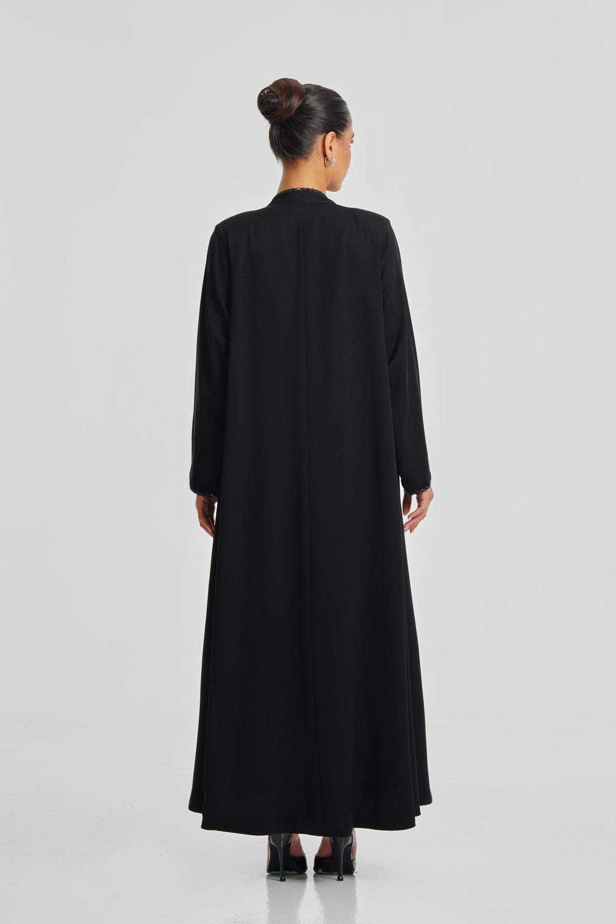 A black Korean Nada abaya featuring handcrafted lace details. Comfortable for daily use and designed to suit all women with its refined artistic touch.
