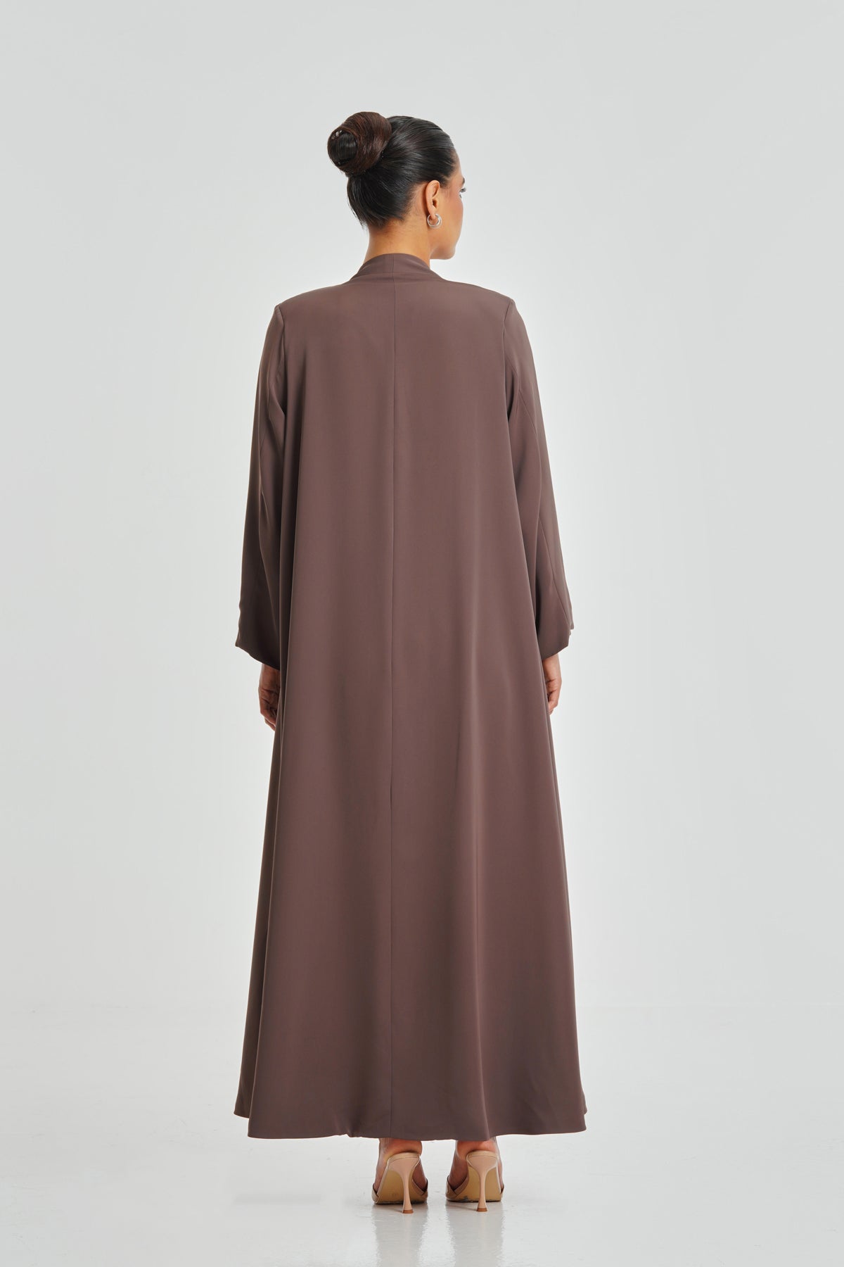 A warm brown Korean Nada abaya designed with smooth fabric and an elegant Italian satin lining. Ideal for everyday wear, offering comfort and sophistication that suits every woman. Its classic cut makes it flattering and timeless.