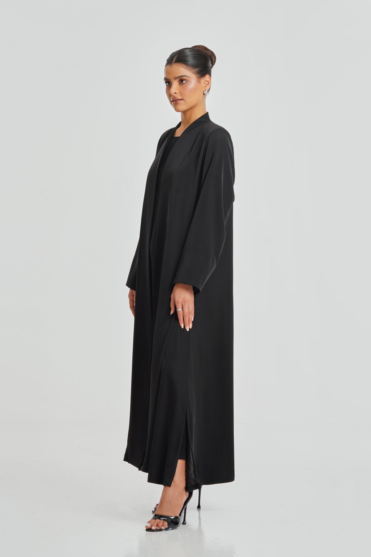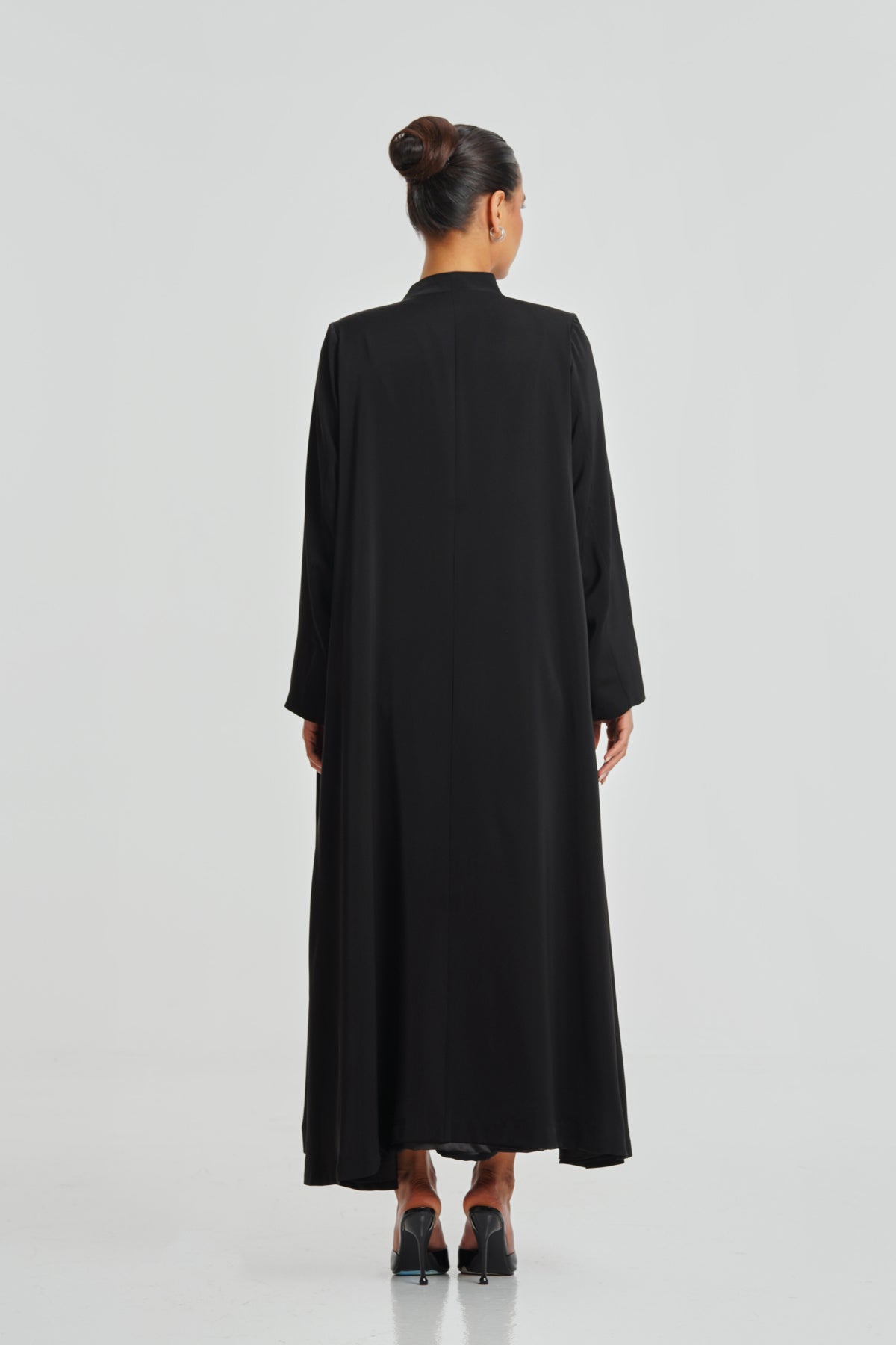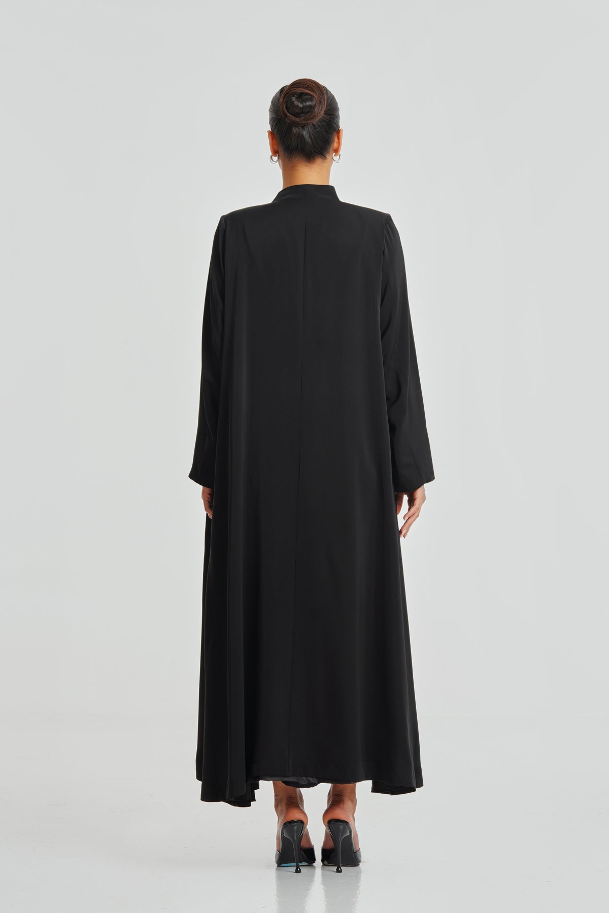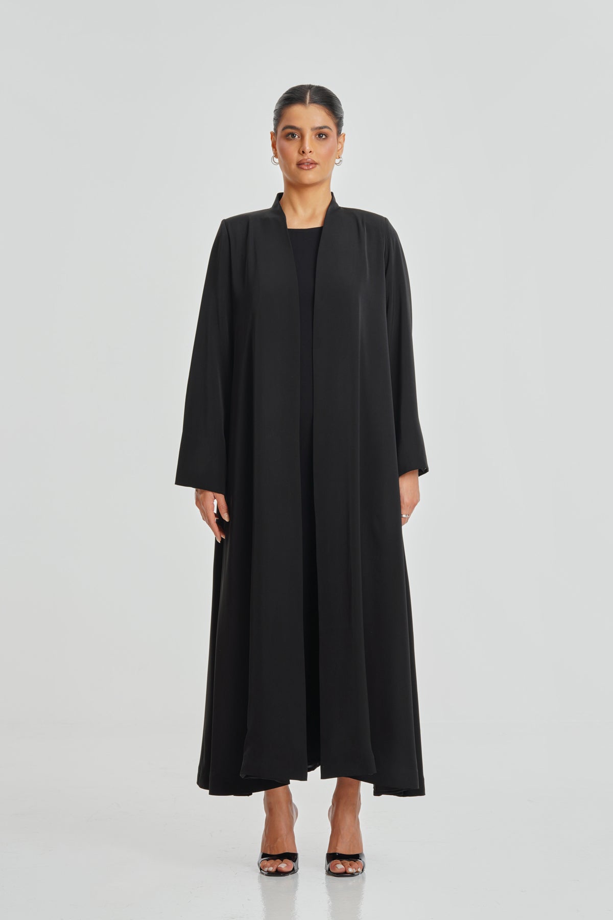 A full black Korean Nada abaya with rich Italian satin lining, perfect for women seeking comfort and simplicity in their everyday look. Its minimalist design is tailored to suit all body shapes while maintaining a refined, elegant appearance.