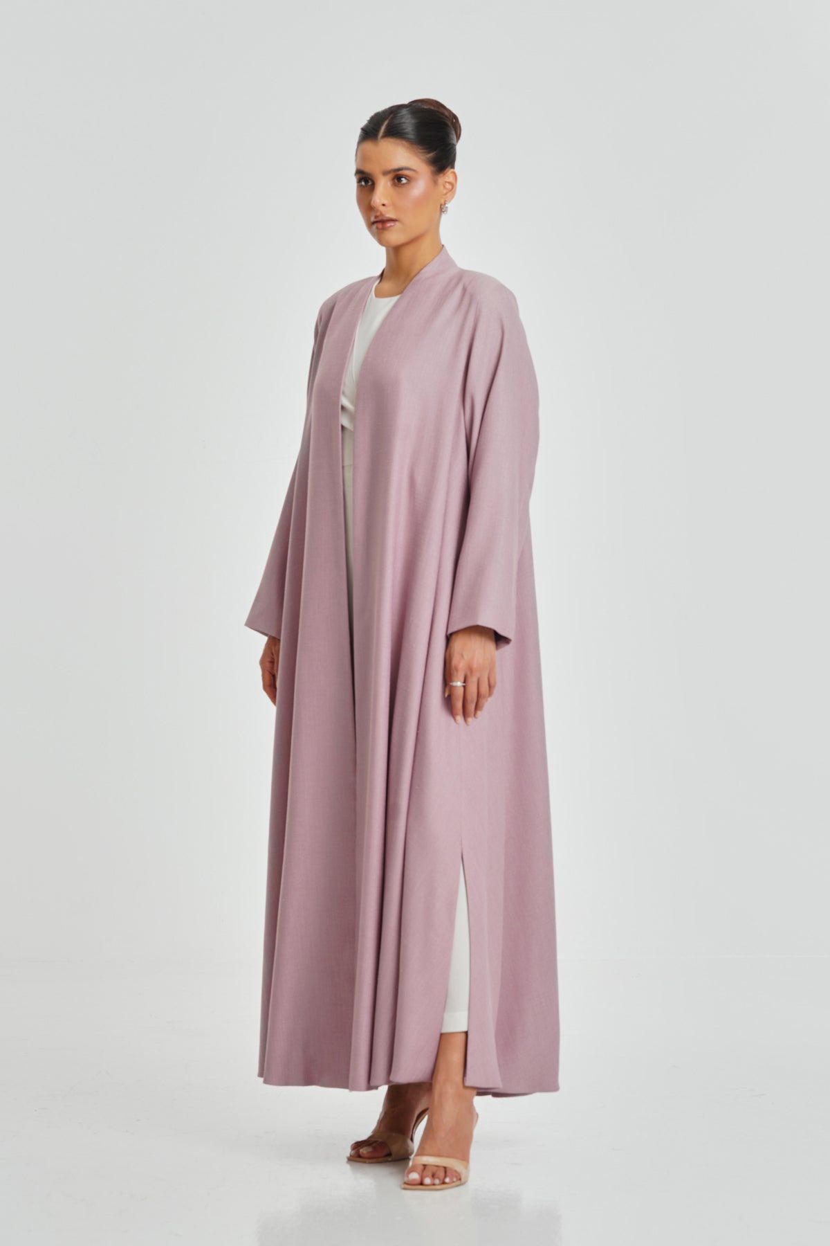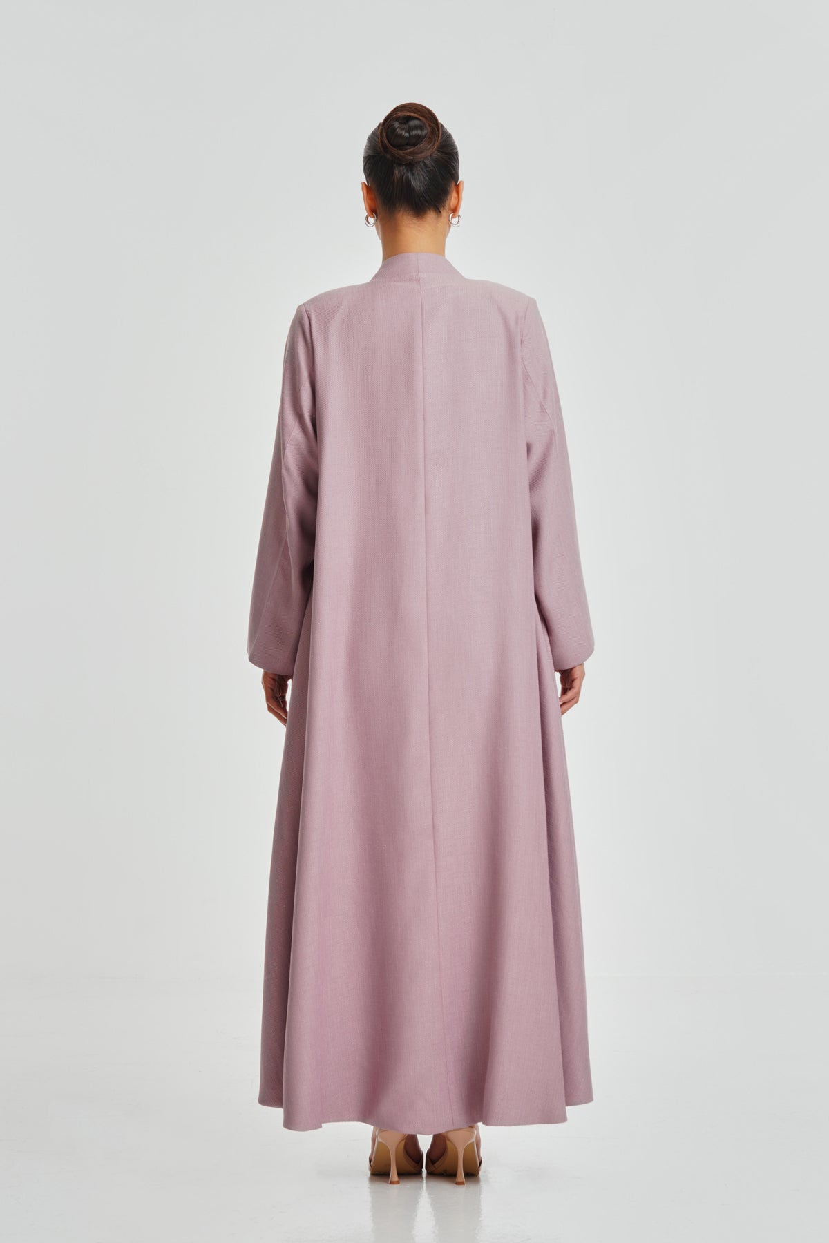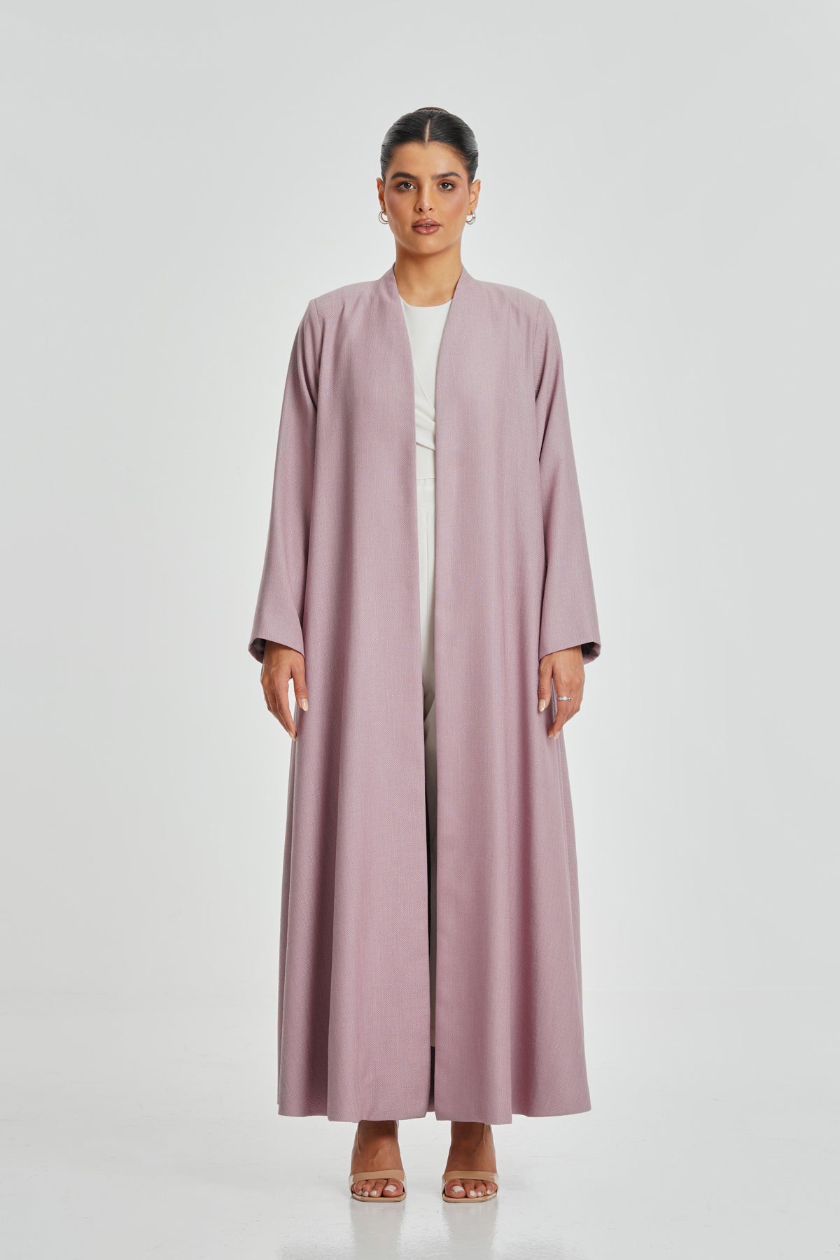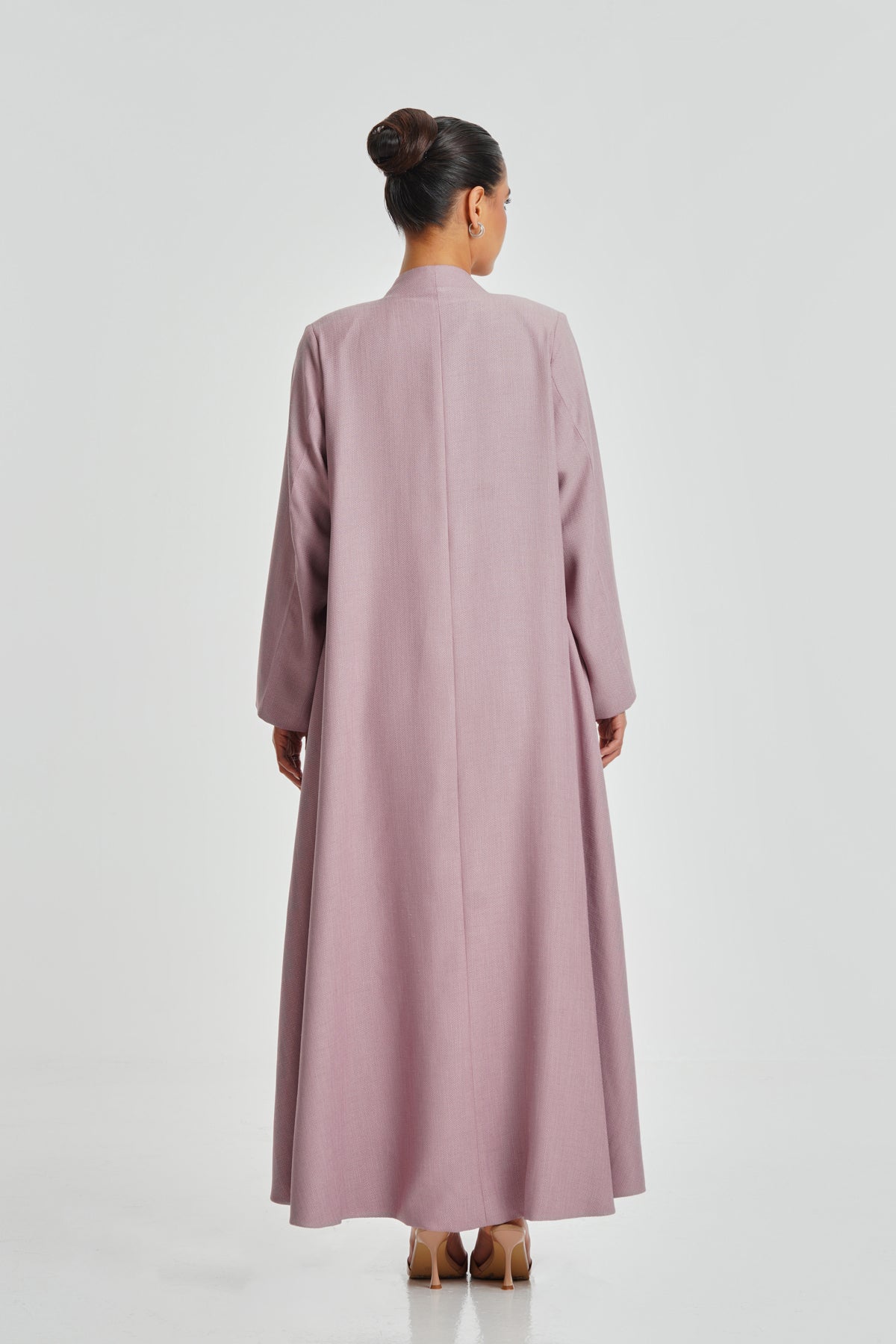 A delicate pink textured crepe abaya lined with Italian satin, offering daily comfort and refined beauty. The textured fabric adds a stylish touch suitable for all women.