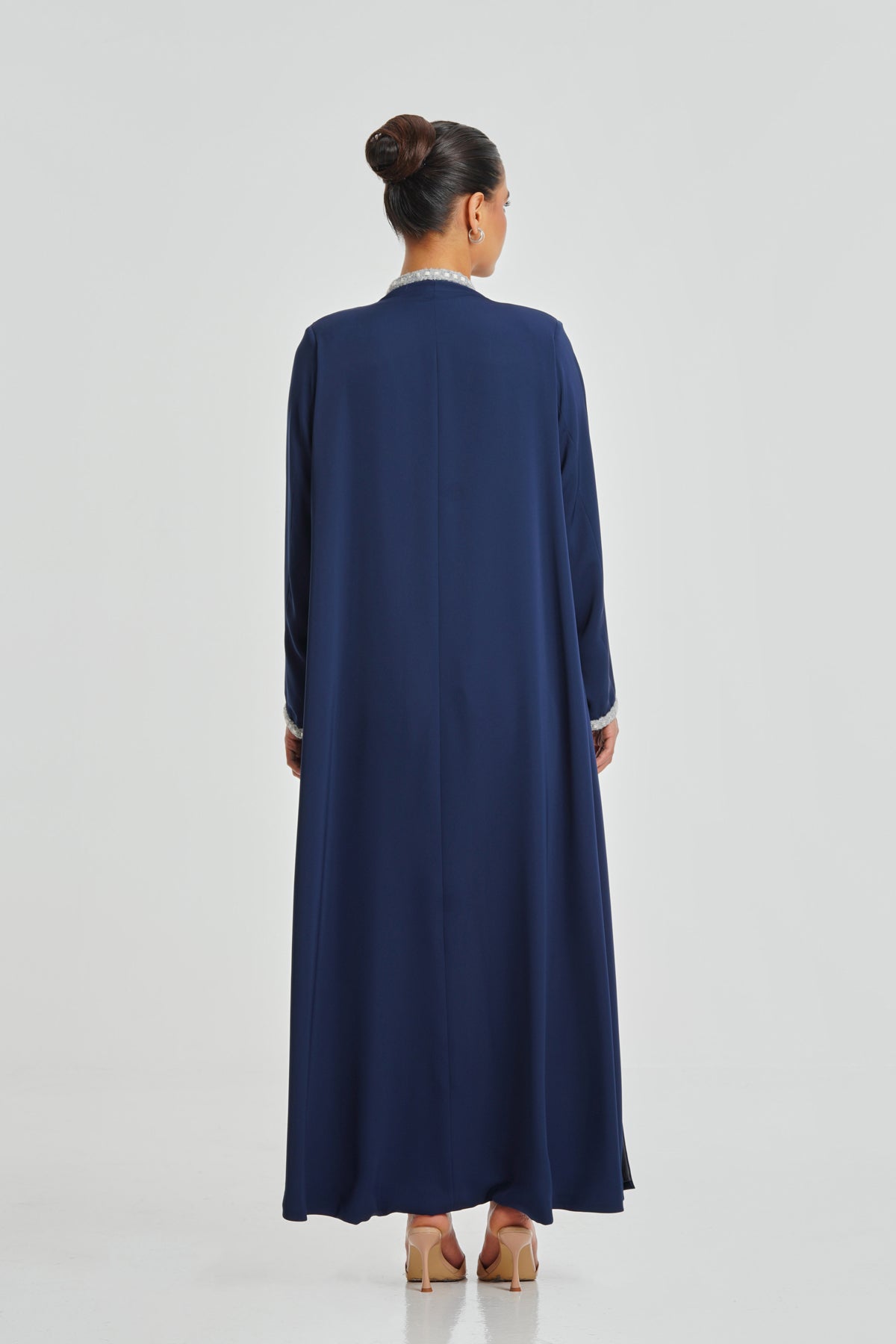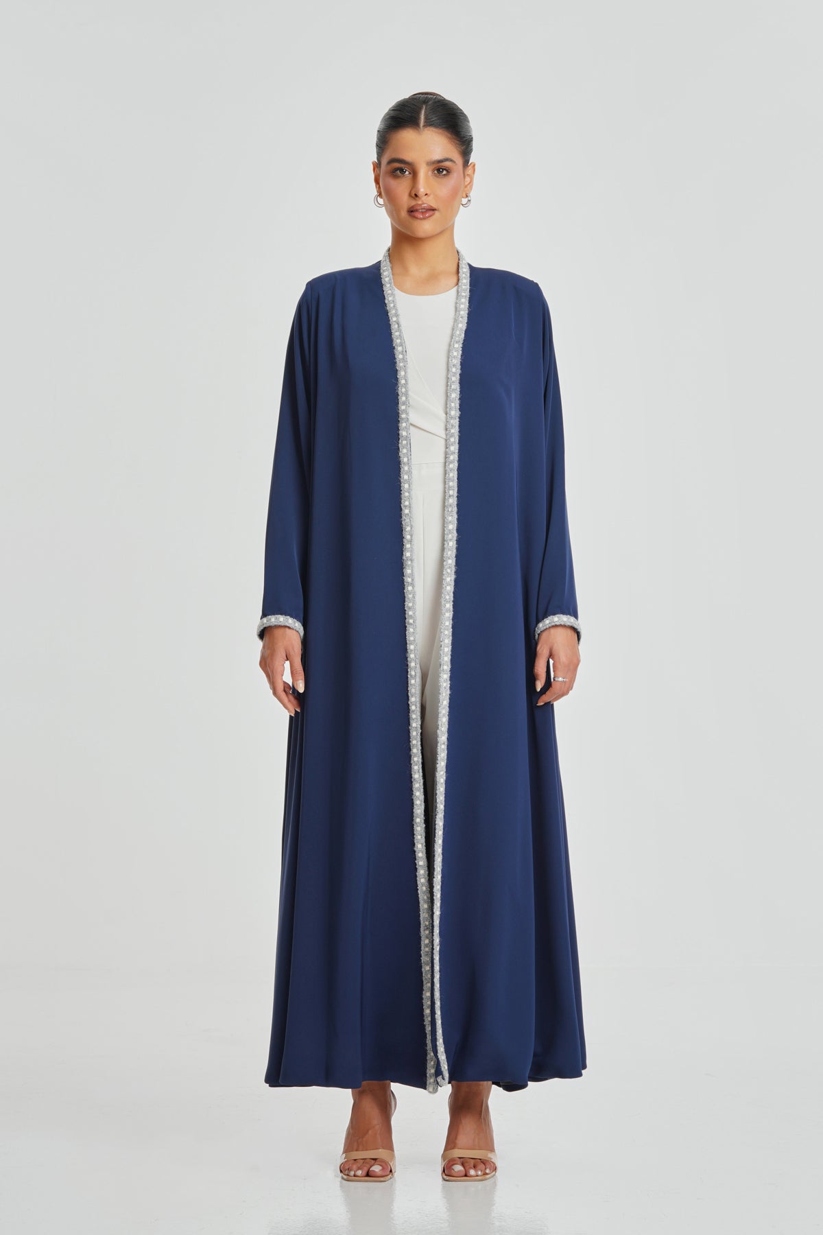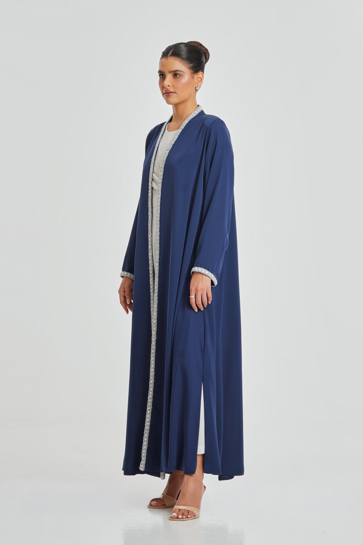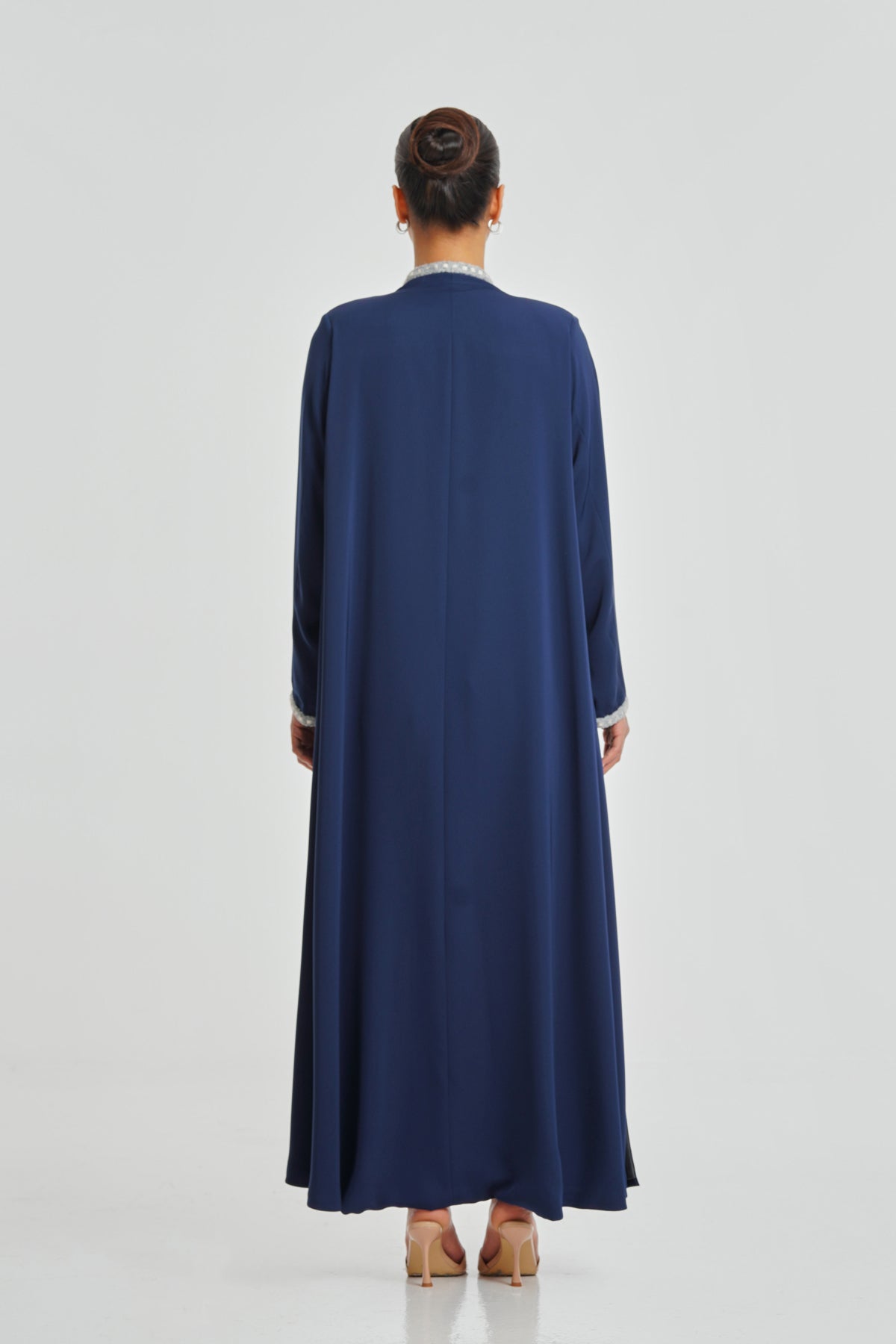 A navy blue Korean Nada abaya detailed with handcrafted lace. Comfortable and stylish for everyday use, designed to suit all women.