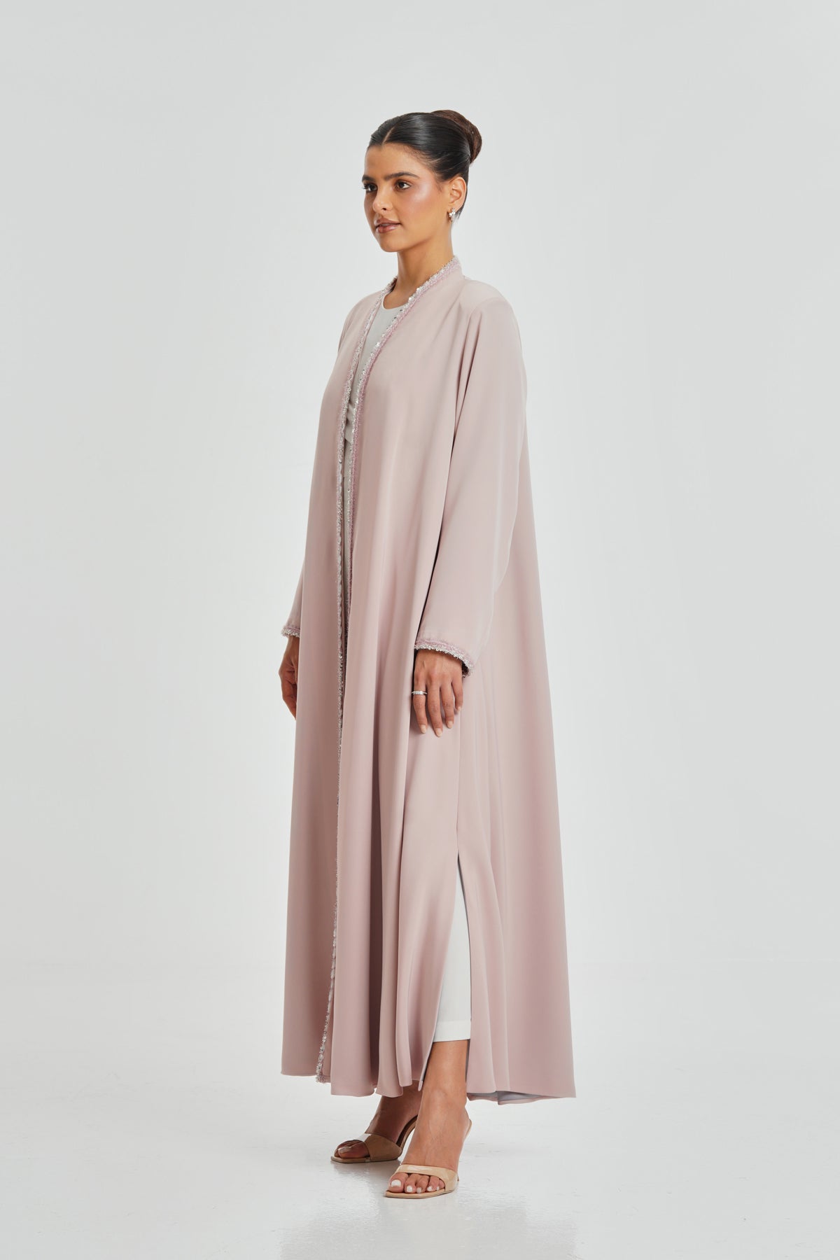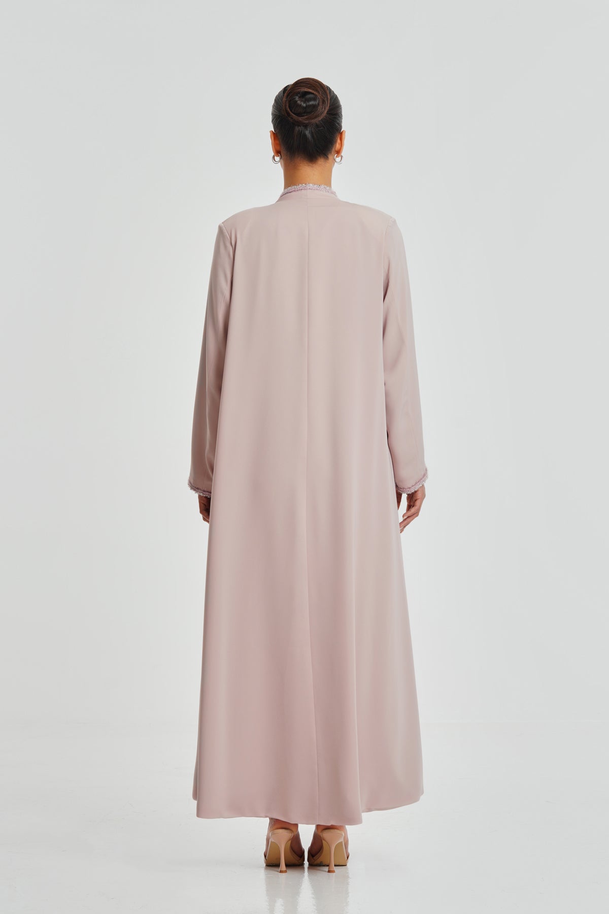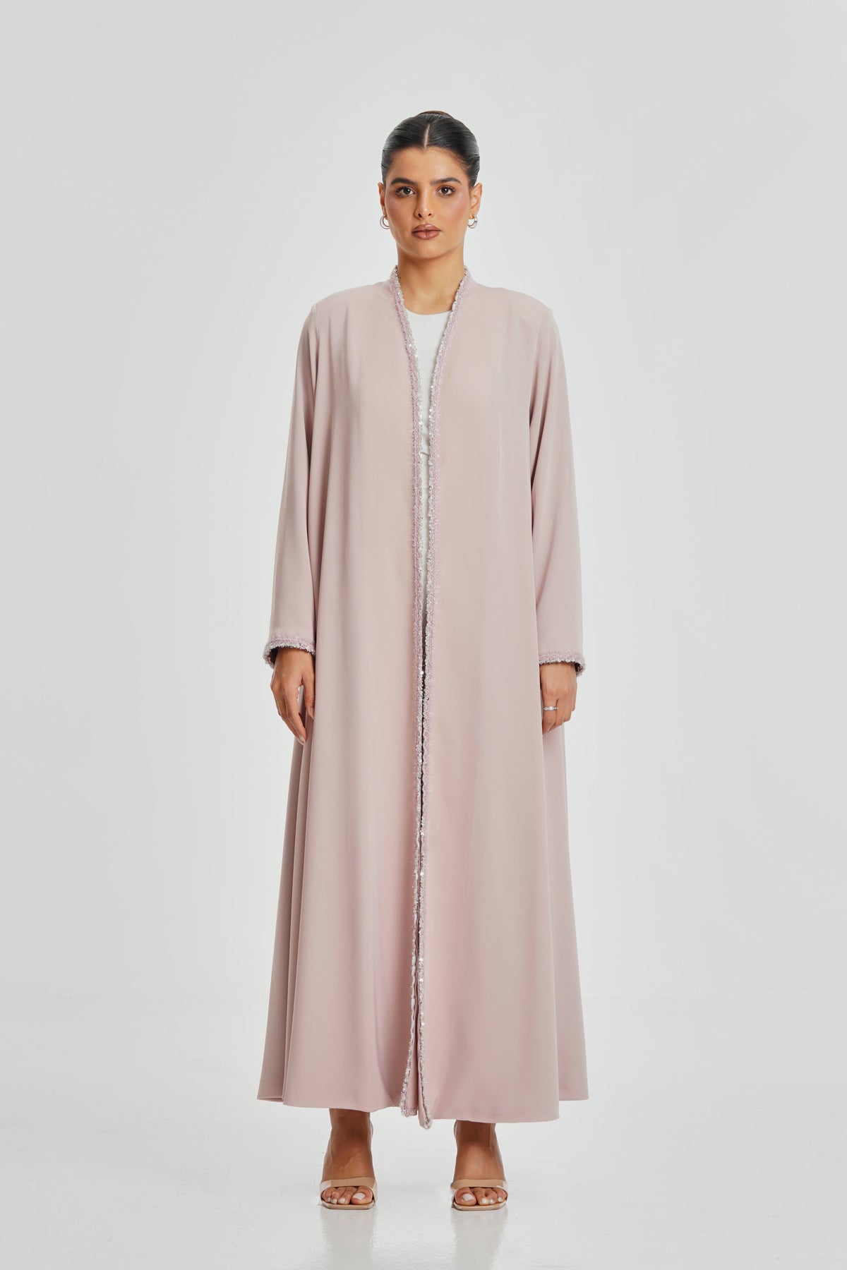 A soft light pink Korean Nada abaya decorated with Japanese crystal lace. Elegant, comfortable, and designed to suit every woman for daily wear.
