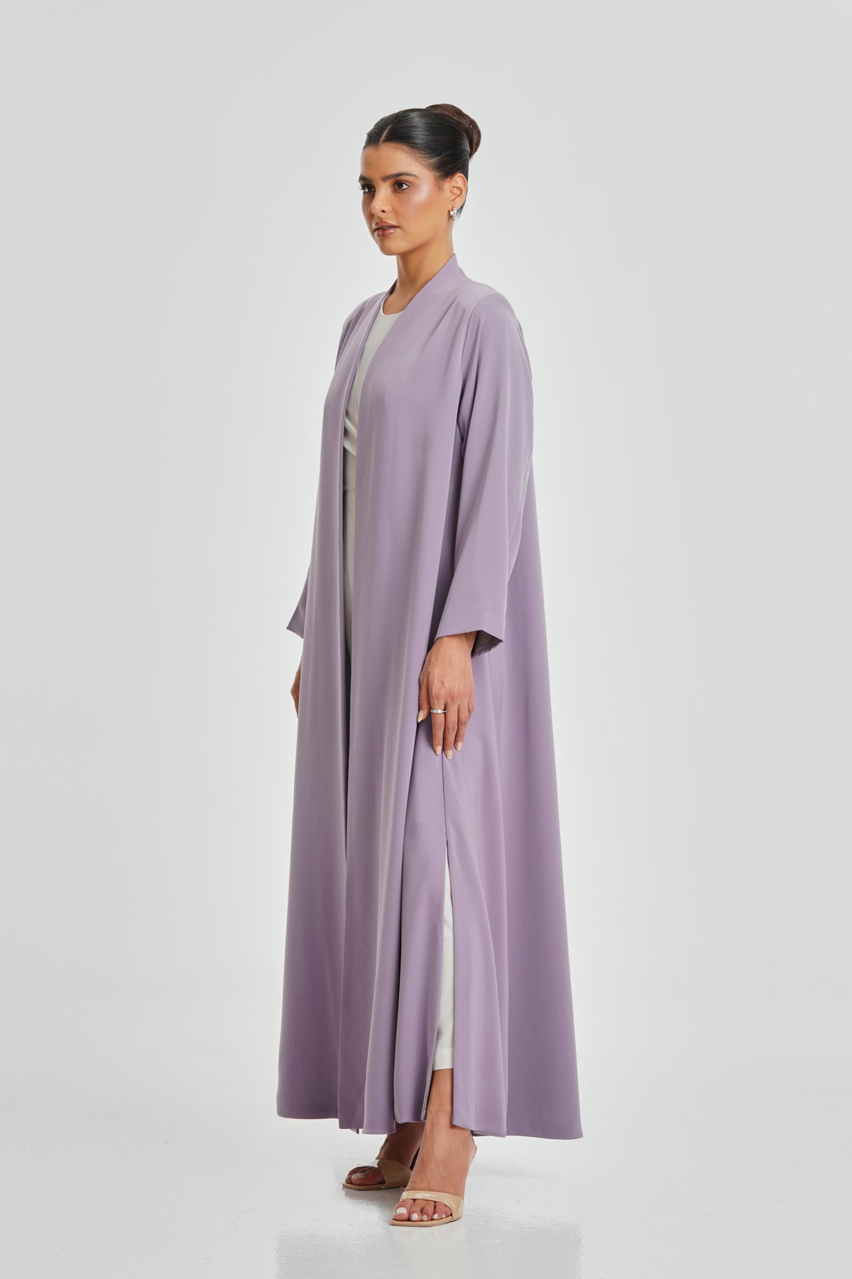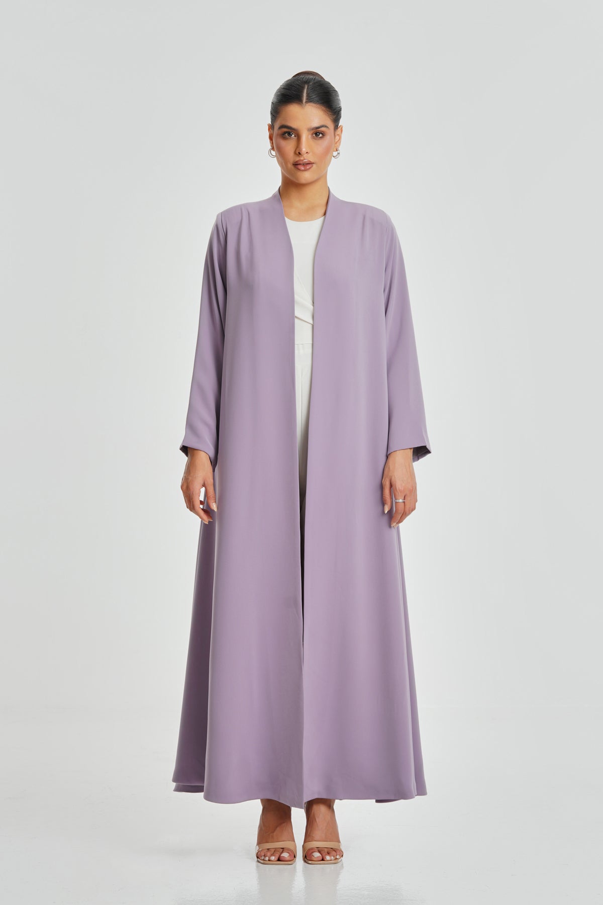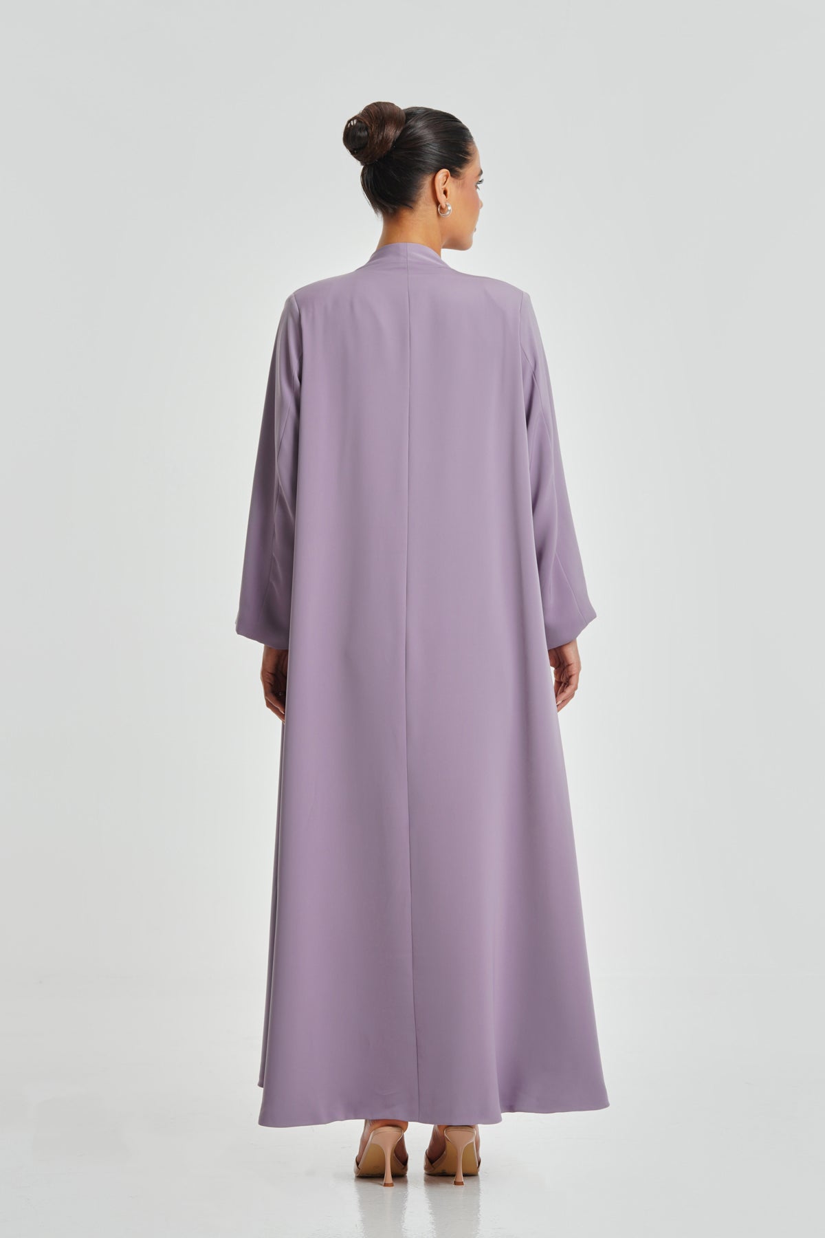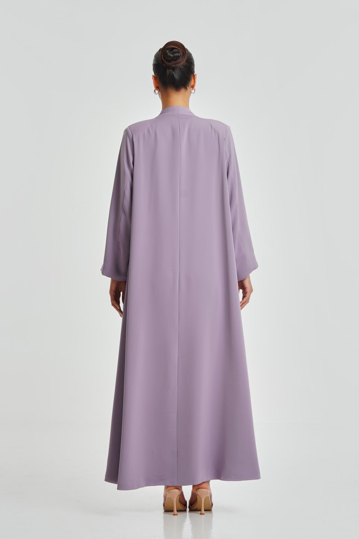 A soft purple-pink Korean Nada abaya featuring luxurious Italian satin lining. Its feminine shade and comfortable fabric make it perfect for everyday wear and suitable for every woman.