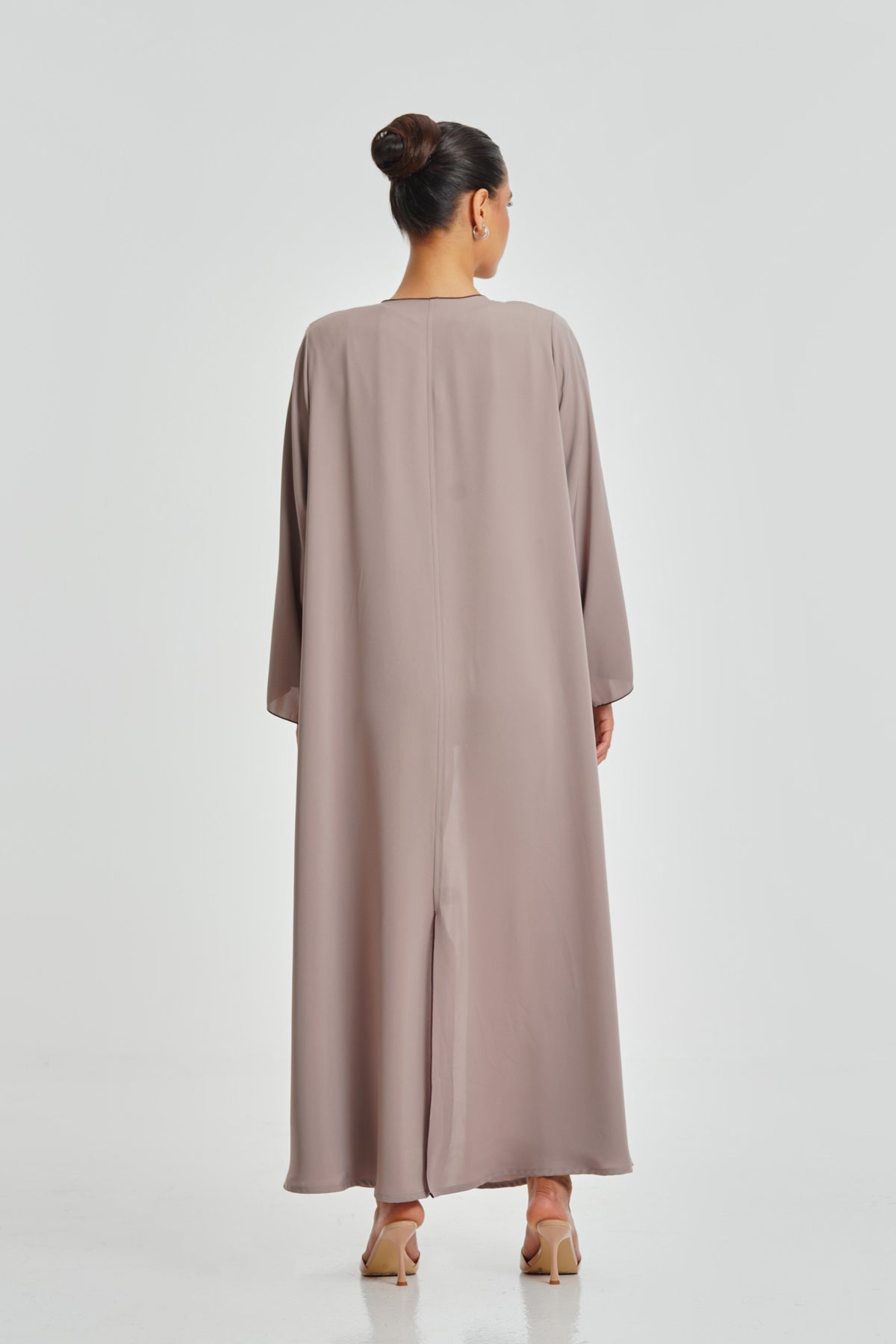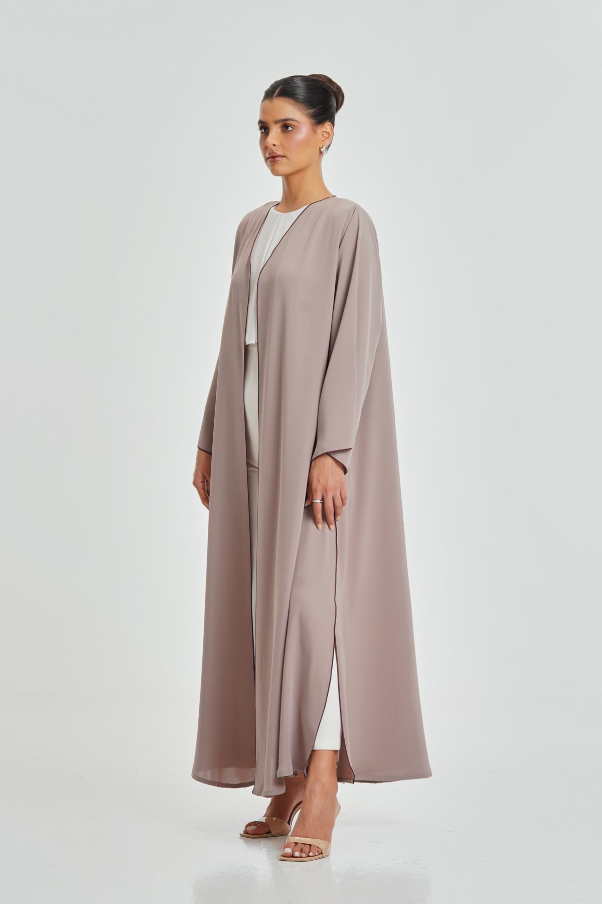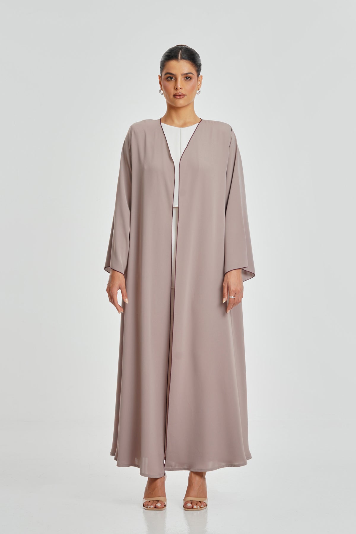 A charming light pink Korean Nada abaya with a deep maroon border. Soft, comfortable, and ideal for everyday wear, made to suit all women.